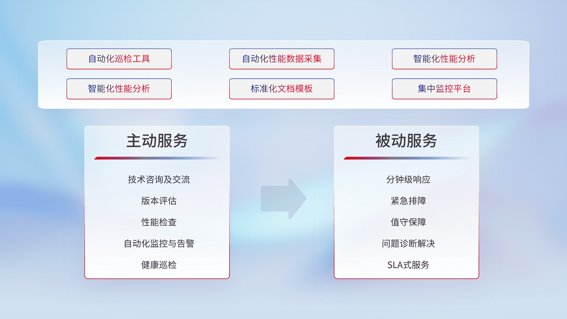 智能化工具和标准化文档,,,,保障服务质量,,,提供主动服务(包含技术咨询、、、、版本评估、、、、性能检查、、自动化监控与告警、、健康巡检)和被动服务包含(分钟级响应、、紧急排障、、值守保障、、、问题诊断解决、、、、SLA服务)。。。。