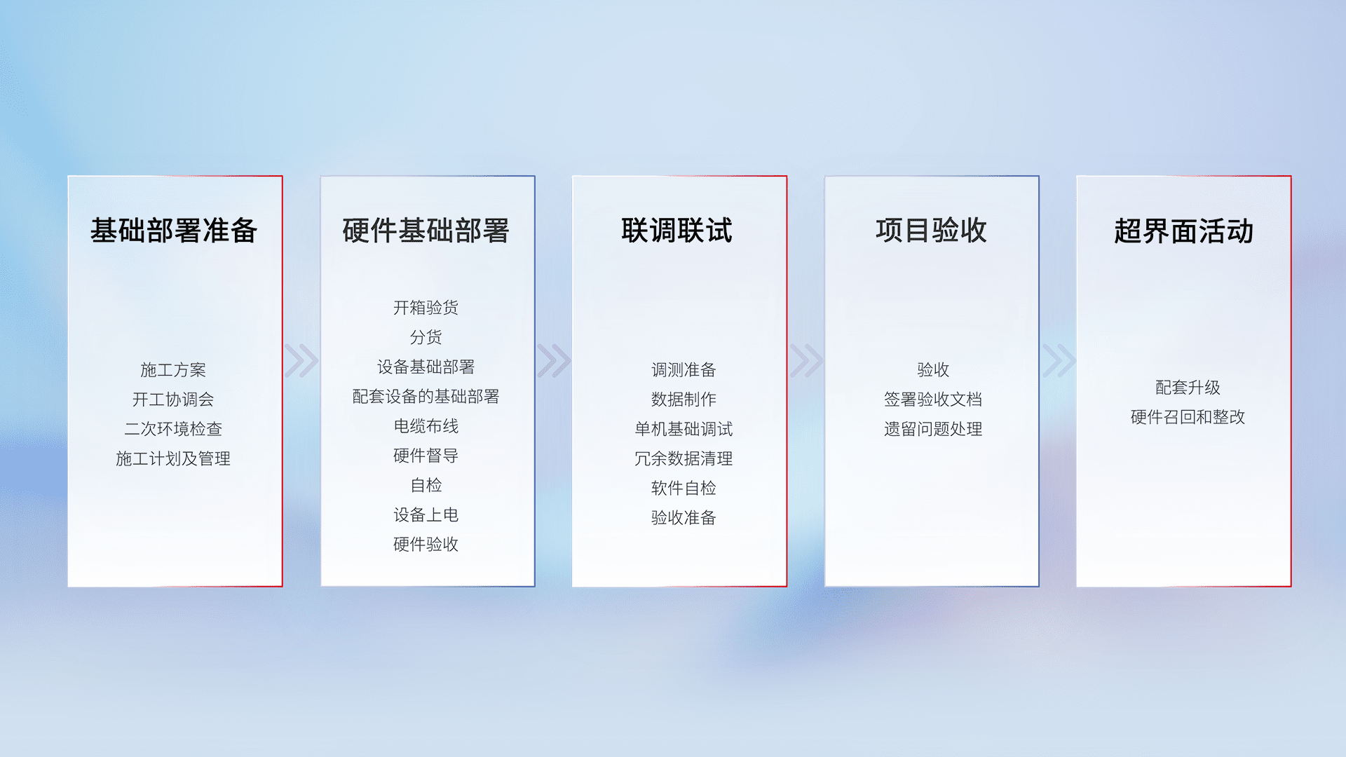 从基础部署准备、、硬件基础部署、、联调联试、、、项目验收、、越界面活动的全过程可追溯,,保证施工质量和进度。。